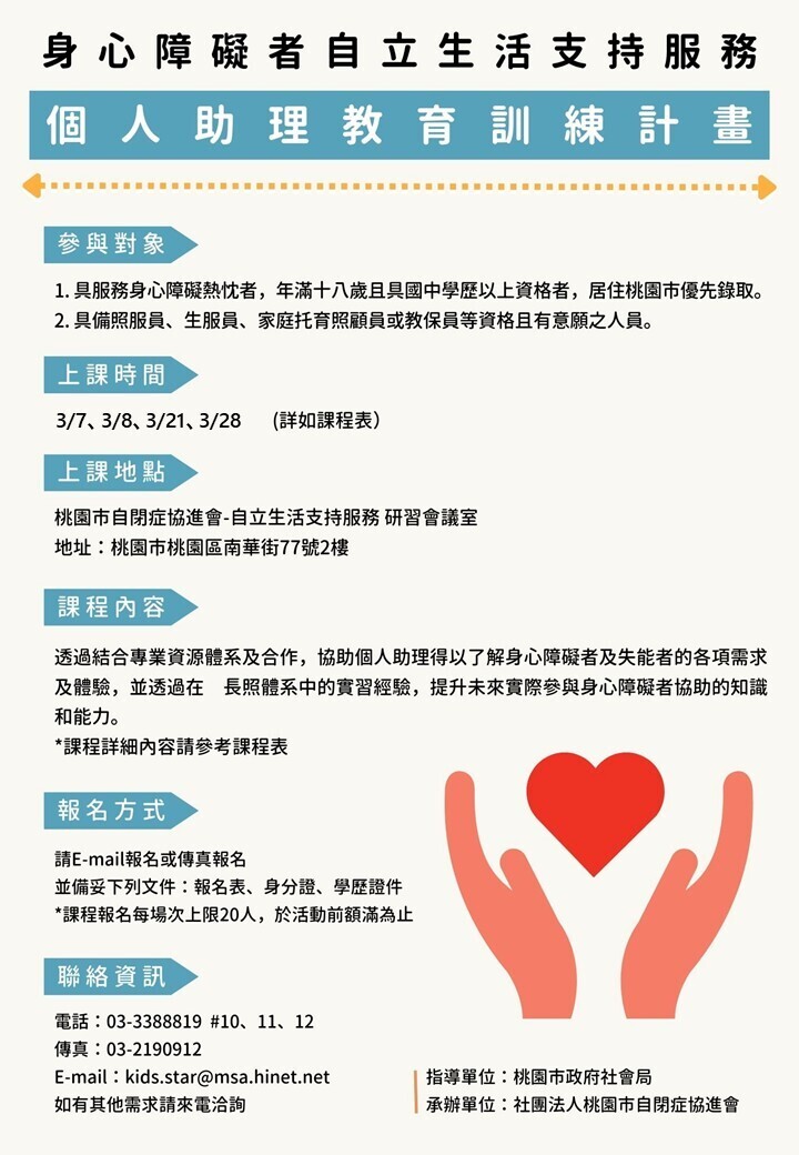 你是否想運用專業,陪伴身心障礙者邁向自立生活?桃園市自閉症協進會推出「個人助理教育訓練計畫」,歡迎具熱忱與資格的你一起加入!